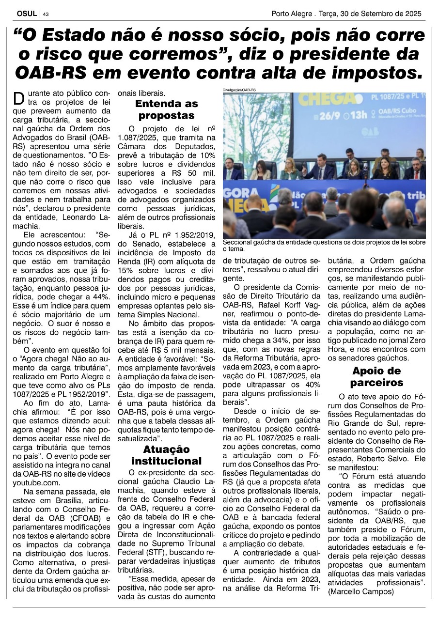 Unindo a advocacia, entidades, autoridades e a sociedade, a OAB/RS realizou, na tarde da sexta-feira (26), no OAB Cubo, em Porto Alegre, o ato público “Agora chega! Não ao aumento da carga tributária - PL 1087/2025 e PL 1952/2019”. As propostas preveem a cobrança de imposto sobre a distribuição de lucros e dividendos, atingindo todas as pessoas jurídicas do país, incluindo sociedades de advogados, microempresas e empresas de pequeno porte optantes pelo Simples Nacional.